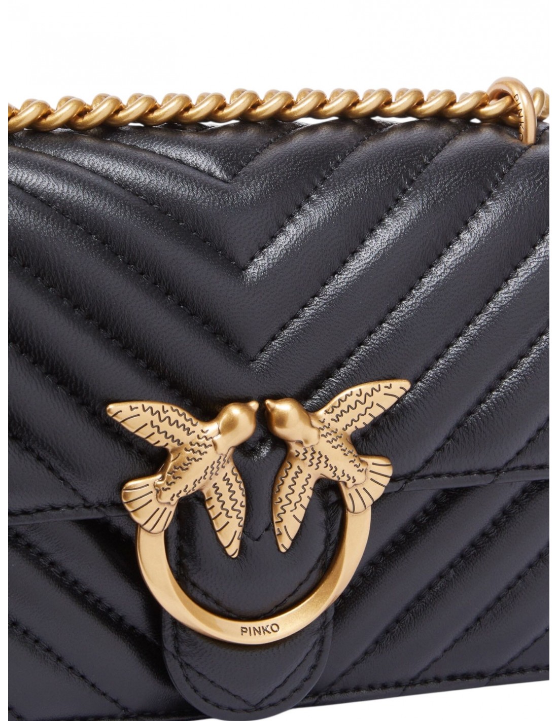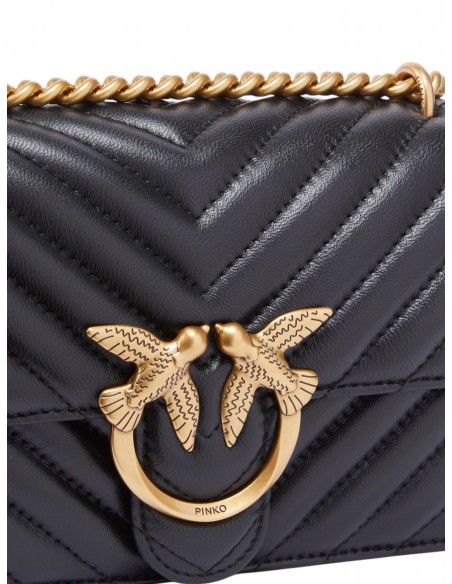 Mini Love Bag One in nappa trapuntata con motivo chevron. La chiusura è completata dall'iconica fibbia in metallo Love Birds Diamond Cut in metallo. L'interno è foderato in microfibra scamosciata e comprende tramezza chiusa con zip e tasca a parete in pelle. La tracolla combina la classica catena rotonda al pratico spallaccio in pelle regolabile.