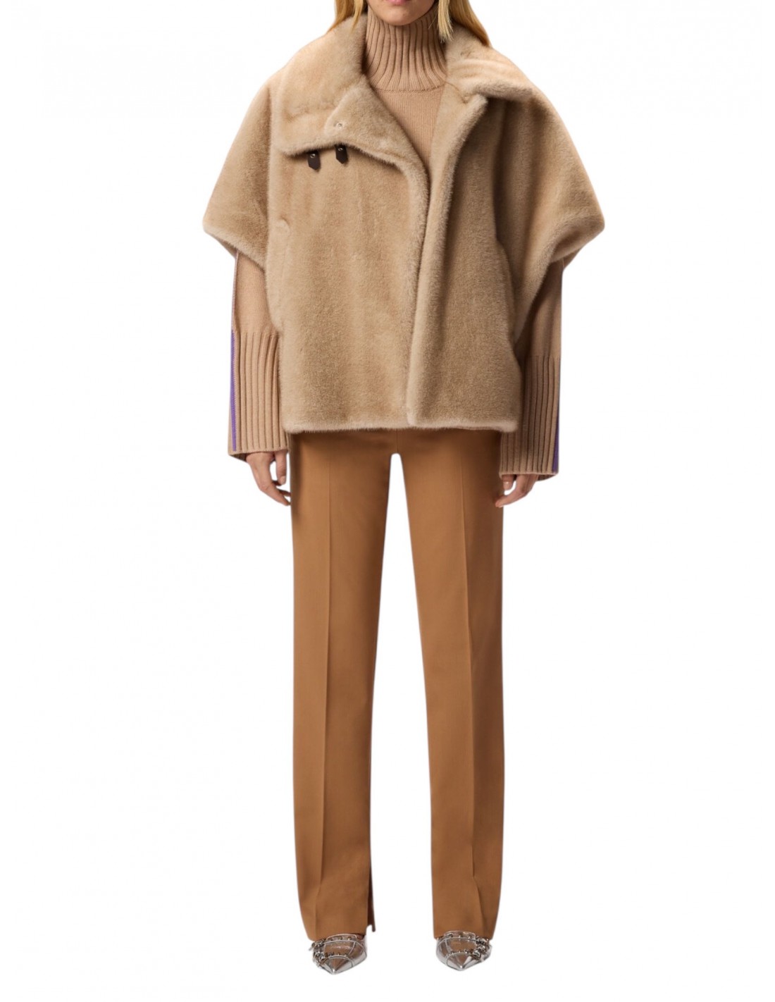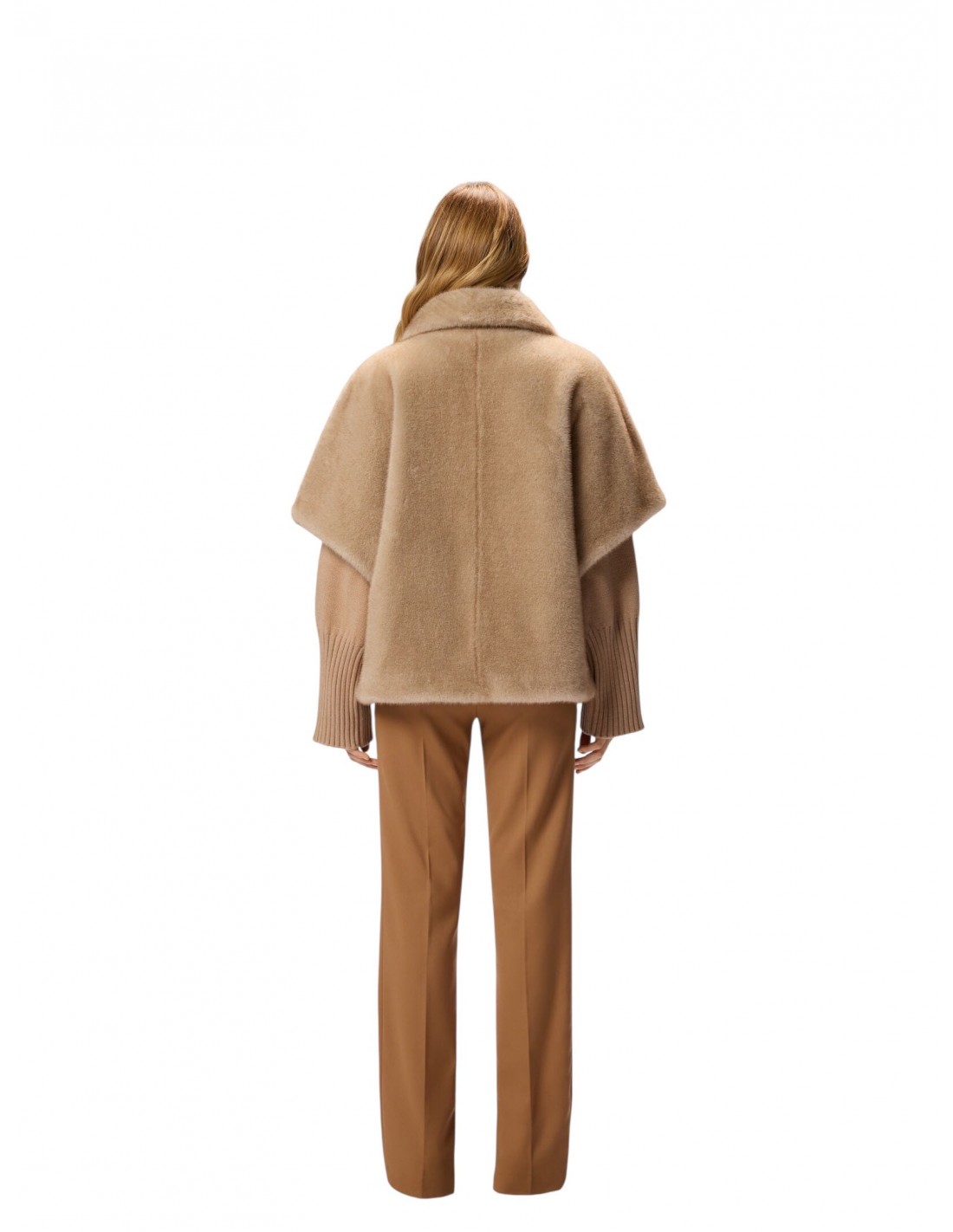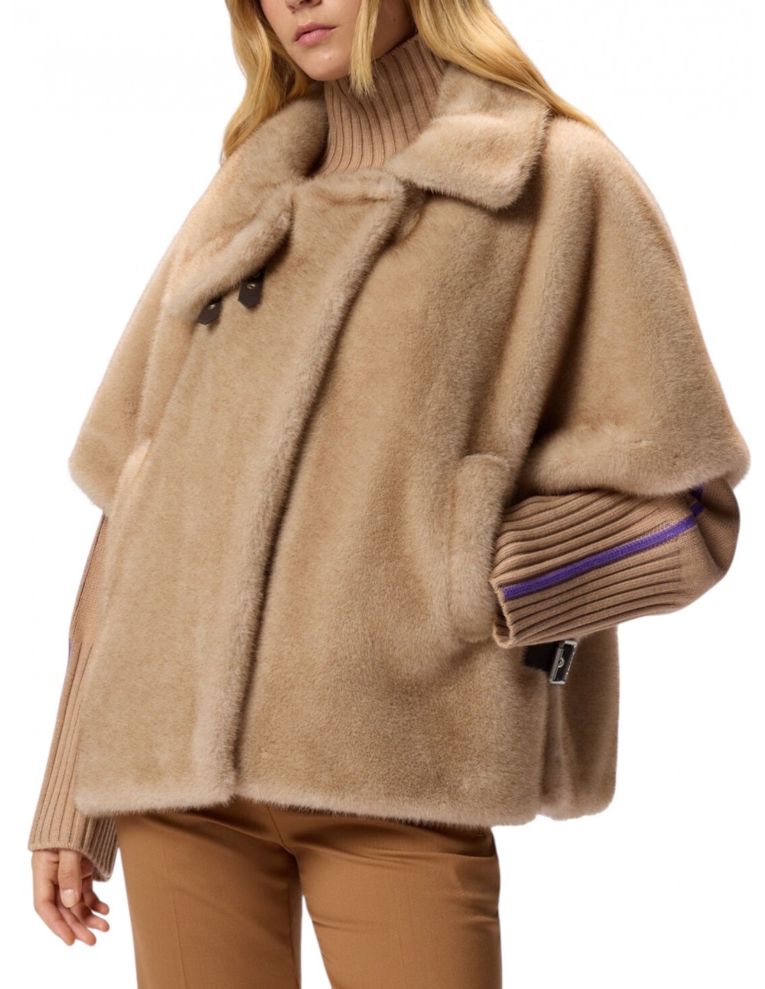 Cappa corta con maniche corte, tasche a filetto, avvolgente collo ripiegato e chiusura frontale decentrata. Il capo è realizzato in morbido tessuto Aspen dall'effetto pelliccia, particolarmente piacevole al tatto. Modello foderato. Il capospalla è ideale per accompagnarti nelle giornate più fresche di inizio stagione all'aperto, con il massimo comfort, senza rinunciare a un tocco di stile.