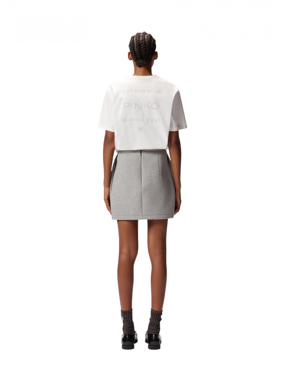 T-shirt in jersey di puro cotone con scollo tondo e maniche corte. Il modello è personalizzato con luminosi strass che ricoprono sia il logo lettering PINKO sul davanti, sia la scritta sul retro con il claim "Sail the blue PINKO IS WITH YOU" e l'immancabile logo Love Birds. Questa t-shirt si abbina con facilità ai tuoi pantaloni preferiti, elevando il tuo look in modo semplice, elegante e originale.