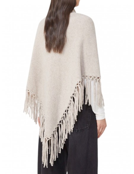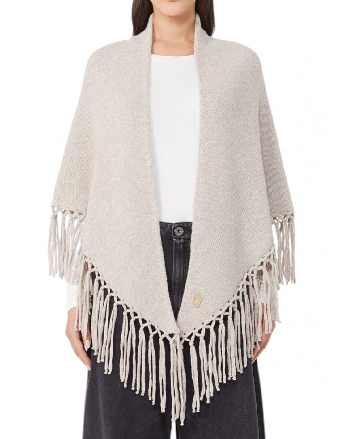 Scialle ampio dalla forma triangolare. Scialle in filato di pura lana Motivo di frange annodate sui lati corti Label farfalla applicata nell'angolo