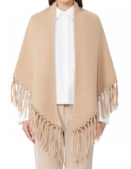 Scialle ampio dalla forma triangolare. Scialle in filato di pura lana Motivo di frange annodate sui lati corti Label farfalla applicata nell'angolo