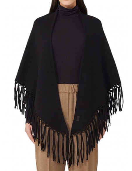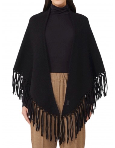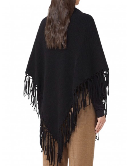 Scialle ampio dalla forma triangolare. Scialle in filato di pura lana Motivo di frange annodate sui lati corti Label farfalla applicata nell'angolo