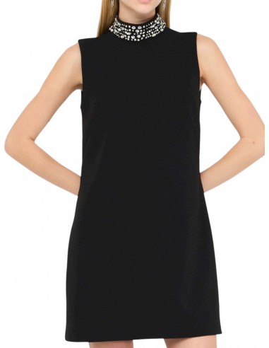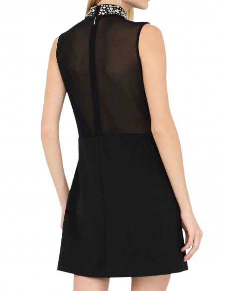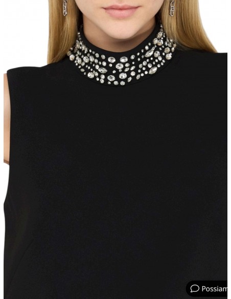 Abito corto in tessuto tecnico stretch Linea ad A Strass applicati Collo alto Chiusura con zip sul retro Fodera interna