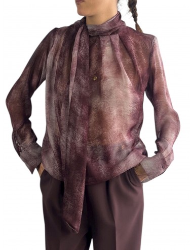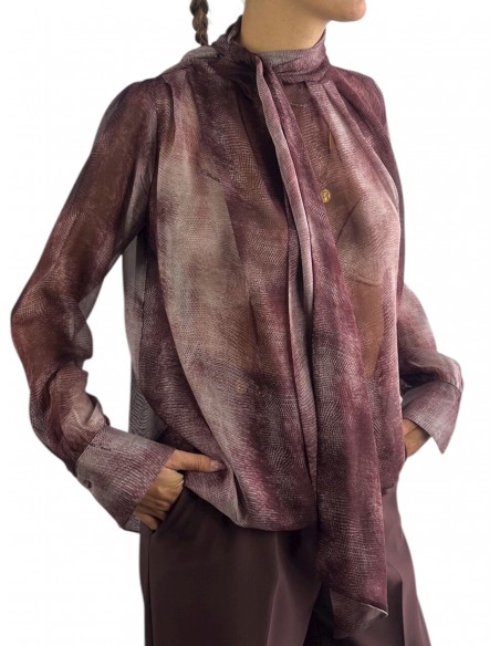 Blusa in voile dalla vestibilità slim. Ha collo con fusciacca da annodare e maniche lunghe con polsi al fondo. Protagonista è la stampa con fantasia pitone, con sfumature.