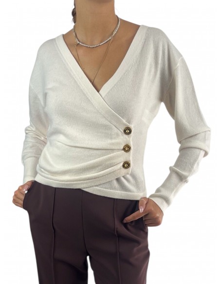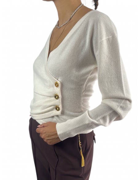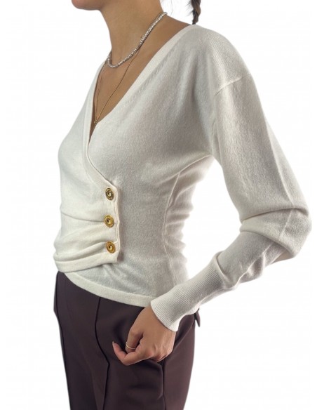 Maglia in misto cachemire dalla vestibilità regular. In una morbida trama che accarezza la pelle, ha scollo a V incrociato e maniche lunghe. Si distingue per i bottoni in metallo dorato posizionati su un fianco, a esaltare il drappeggio centrale.