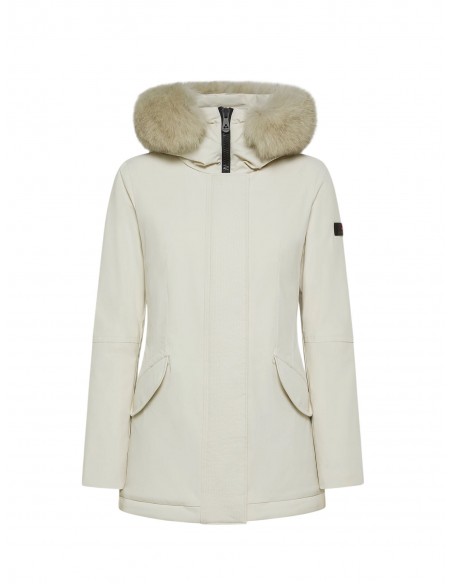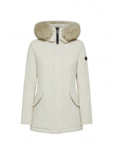 Piumino liscio in piuma riciclata e tela di nylon stretch, dotato di membrana performante resistente a pioggia e vento. Il modello è impreziosito da un ampio collo in pelliccia di volpe staccabile, in tono colore e ha un impeccabile fit asciutto che valorizza la silhouette femminile. Chiusura nascosta con zip a doppio cursore e bottoni. La moderna essenzialità del design fa di questo capo un must-have del guardaroba invernale. Versatile, consente molteplici abbinamenti e accompagna con stile impeccabile le diverse occasioni d’uso.