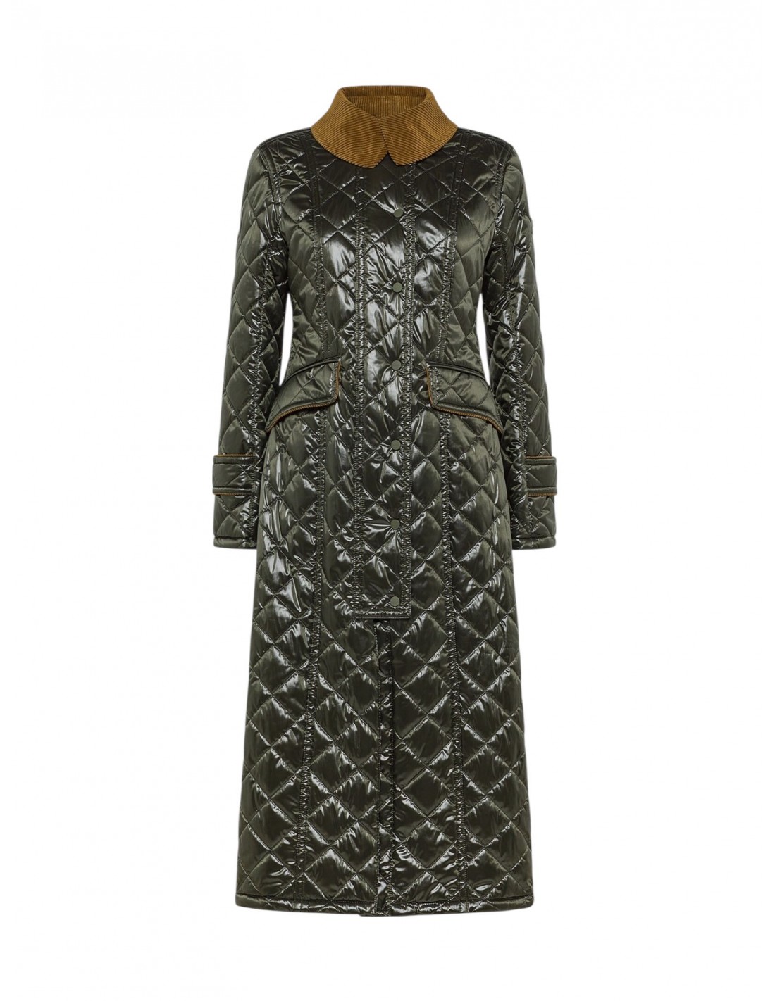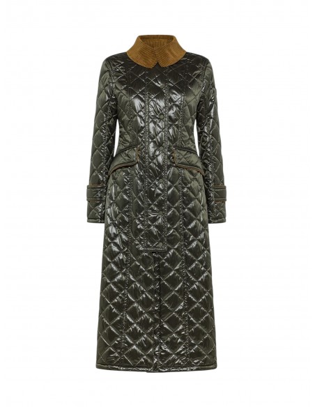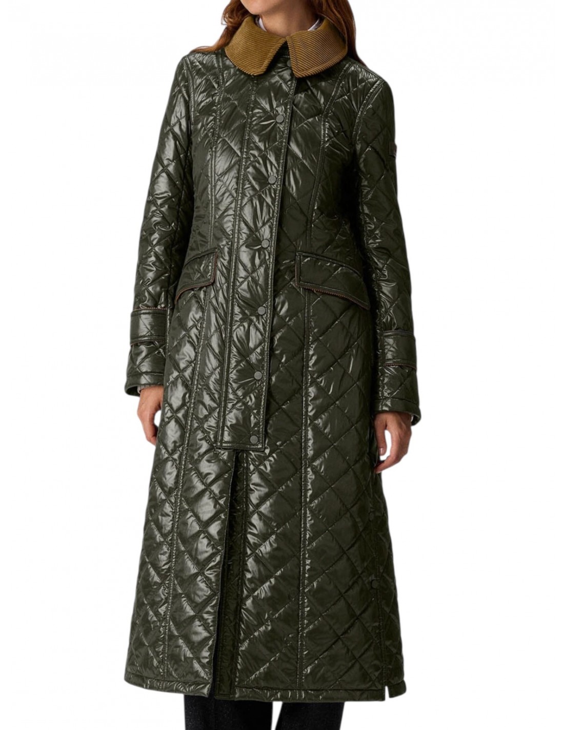 Cappotto trapuntato lungo in tela di nylon 20 denari con tintura a bassa energia e finissaggio cinzato che conferiscono al tessuto un effetto lucido e cangiante, unito a una mano morbida e confortevole. Il modello ha un’elegante shape a sirena. La trapunta matelassé sottolinea la silhouette, mentre il colletto in velluto a costine, in contrasto colore, aggiunge una nota rétro sofisticata. La zip centrale è nascosta da una patta con bottoni per un look ordinato e ricercato. L’imbottitura è in materiale sintetico e il tessuto è trattato con finitura idrorepellente PFC Free, priva di sostanze chimiche dannose per l’ambiente. Novità di stagione della linea Countryside, che rivisita i classici britannici con una visione moderna e femminile, ispirata ai paesaggi autunnali delle High