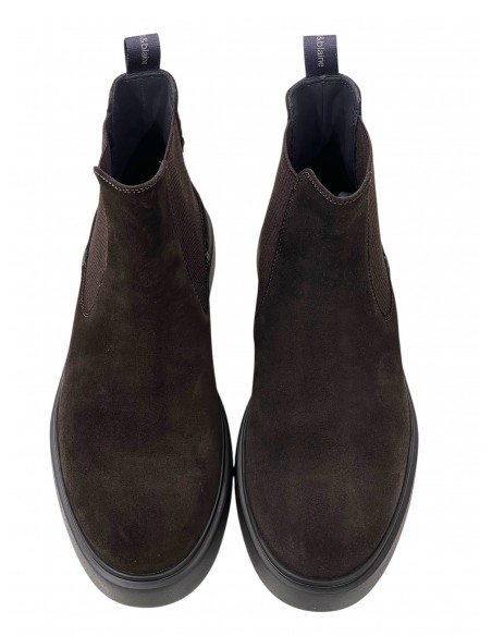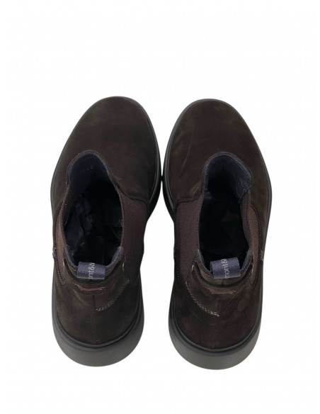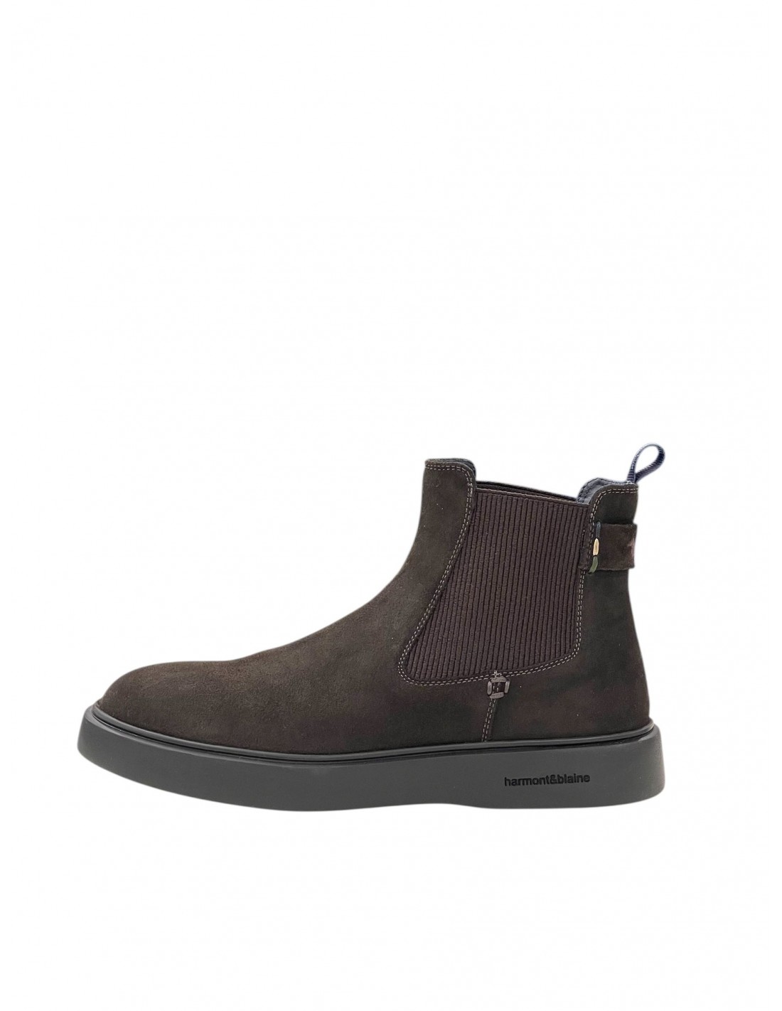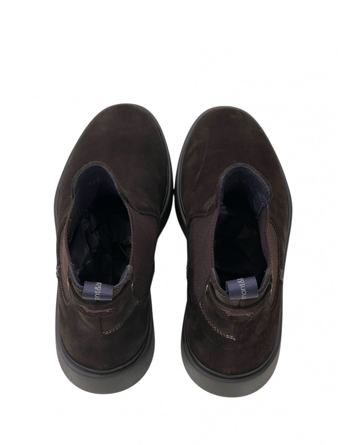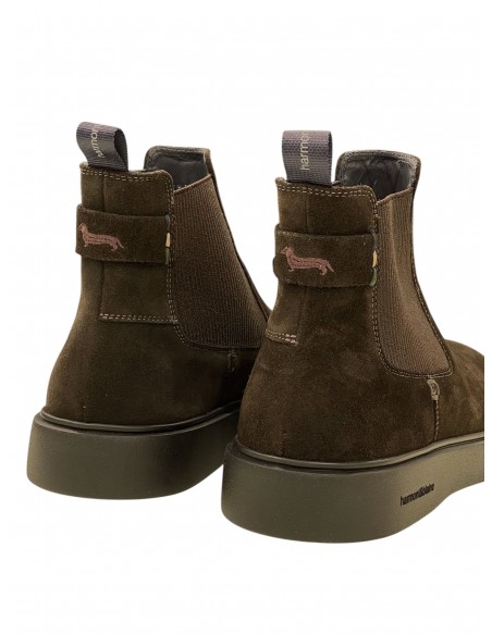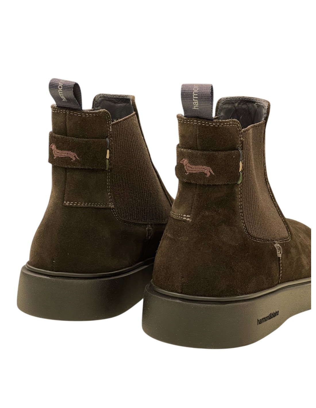 Stivaletto scamosciato marrone con logo applicato dietro e dettaglio su suola.