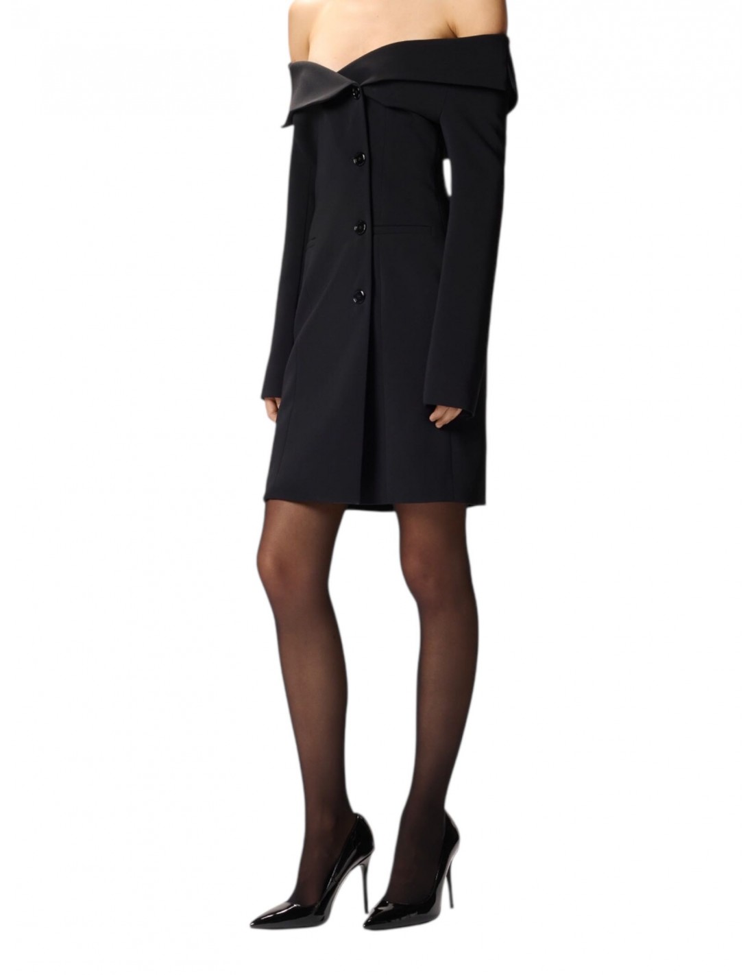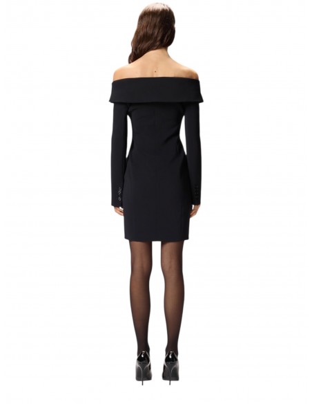 Vestito corto aderente a maniche lunghe realizzato in tessuto crêpe stretch che sottolinea la figura. L'abbottonatura decentrata, i polsini con bottoni e le tasche laterali a filetto sono un chiaro rimando al design di un classico blazer, mentre lo scollo ampio che lascia le spalle scoperte rende il modello decisamente femminile