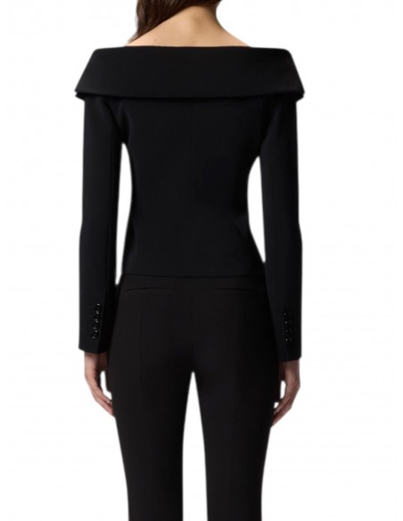 Giacca aderente a maniche lunghe realizzata in tessuto crêpe stretch che sottolinea la figura. L'abbottonatura decentrata, i polsini con bottoni e le tasche laterali a filetto sono un chiaro rimando al design di un classico blazer, mentre lo scollo ampio che lascia le spalle scoperte rende il modello decisamente femminile