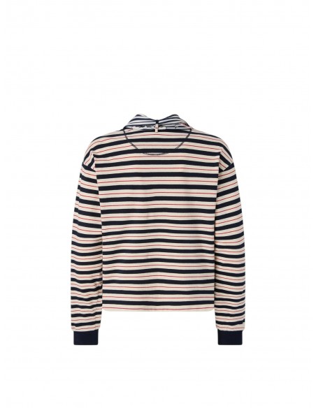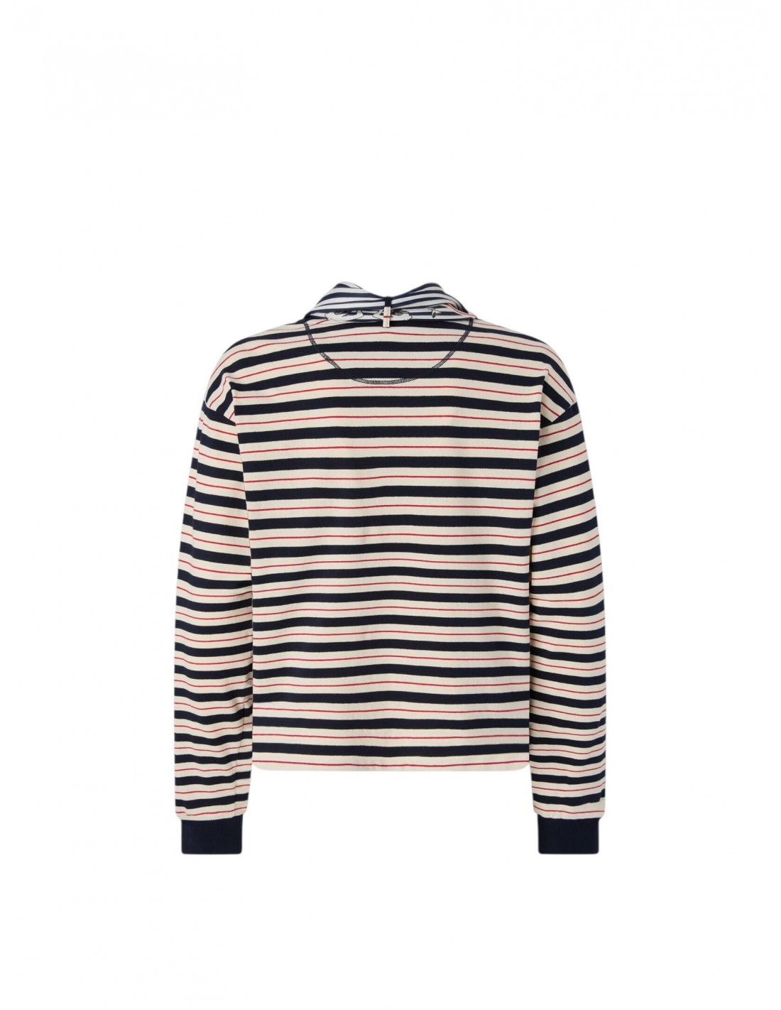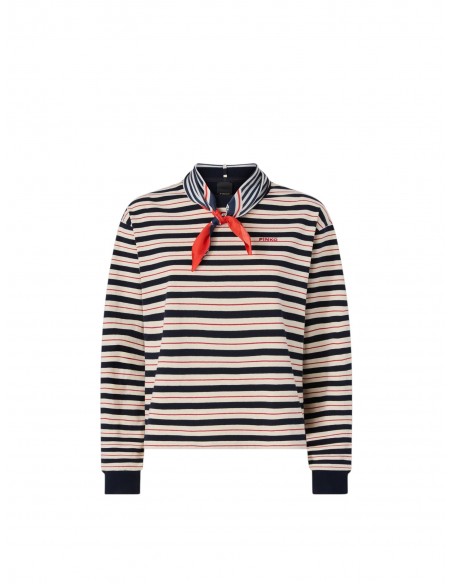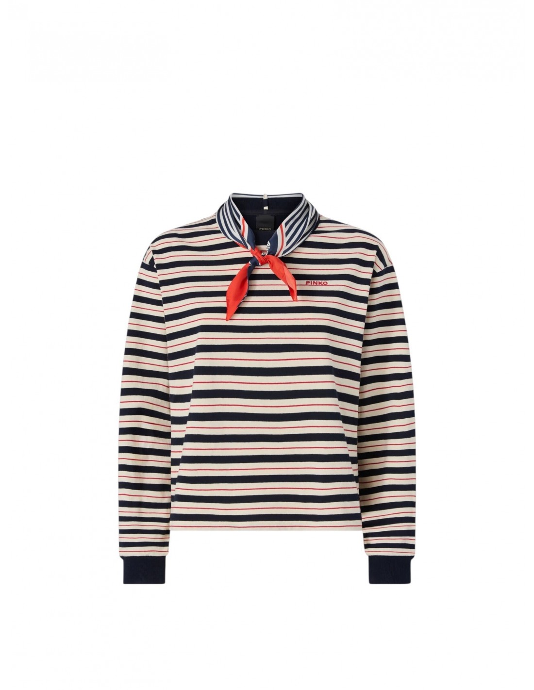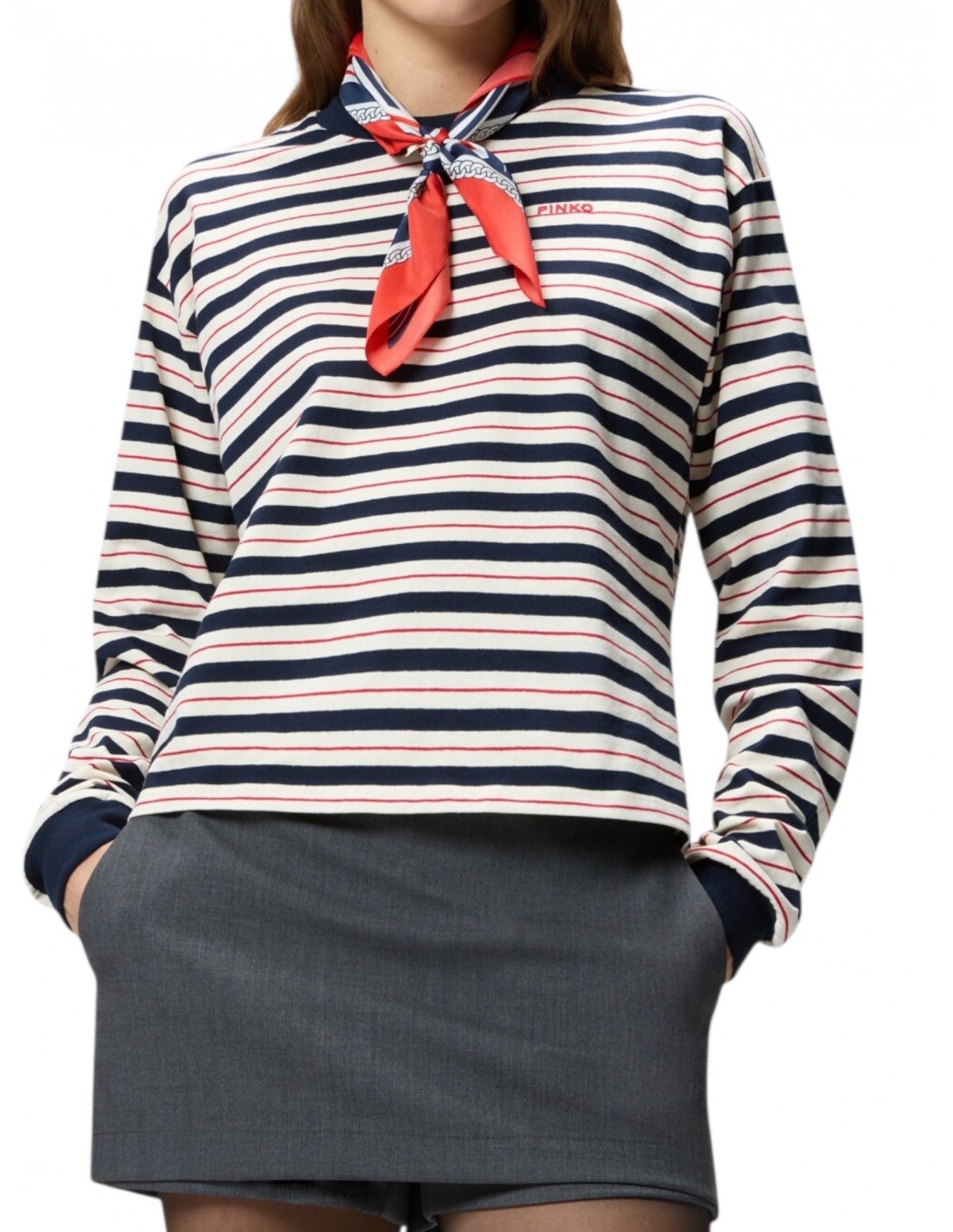 Maglia a maniche lunghe in cotone con righe orizzontali, dal taglio classico rivisitato in chiave contemporanea. Colletto impreziosito da foulard removibile e ricamo rosso “PINKO” sul petto che aggiunge un tocco distintivo. Il foulard rosso annodato al collo completa il look con un accento audace e raffinato. Ideale da indossare con jeans flare e mocassini per un outfit casual chic dal gusto parigino.