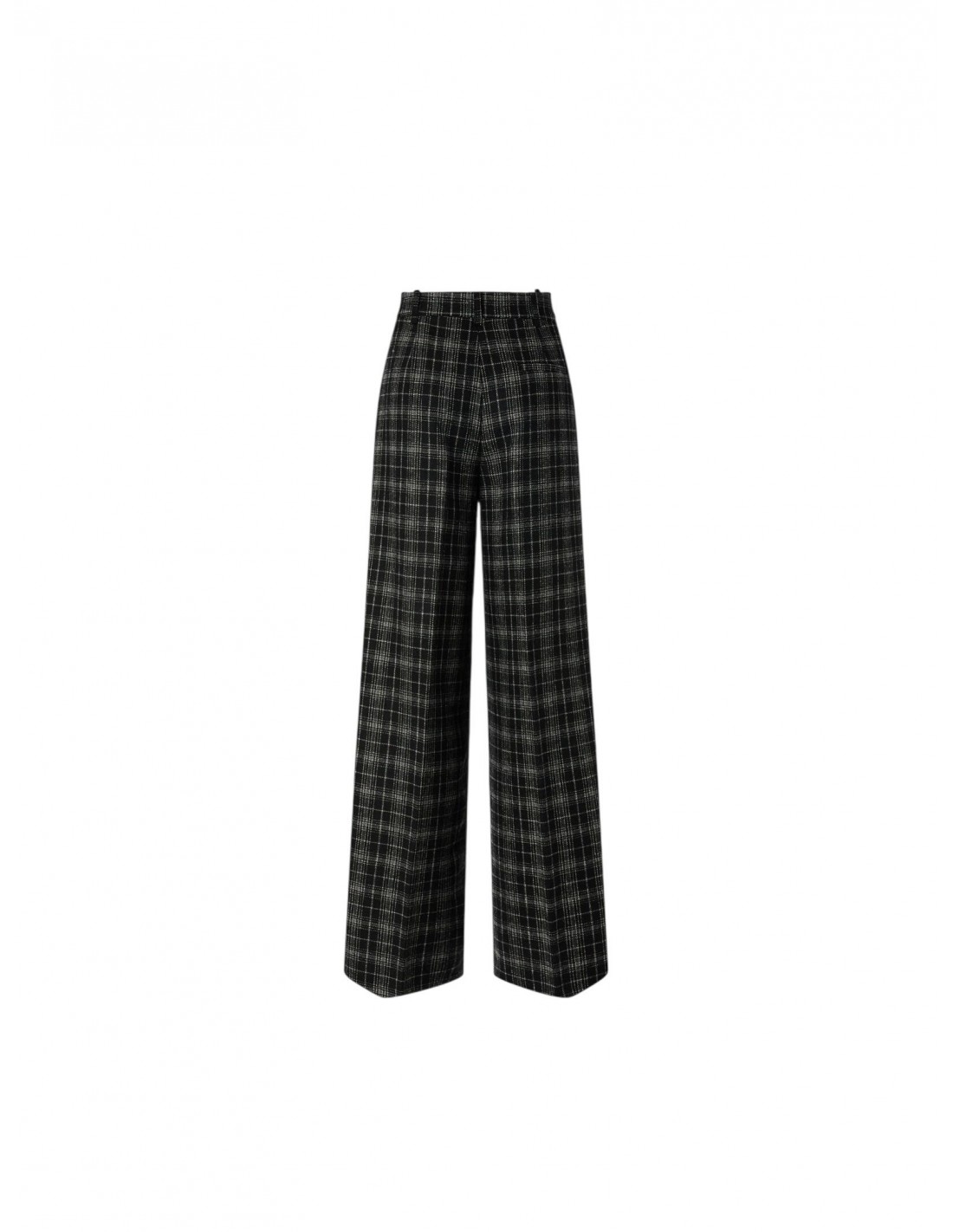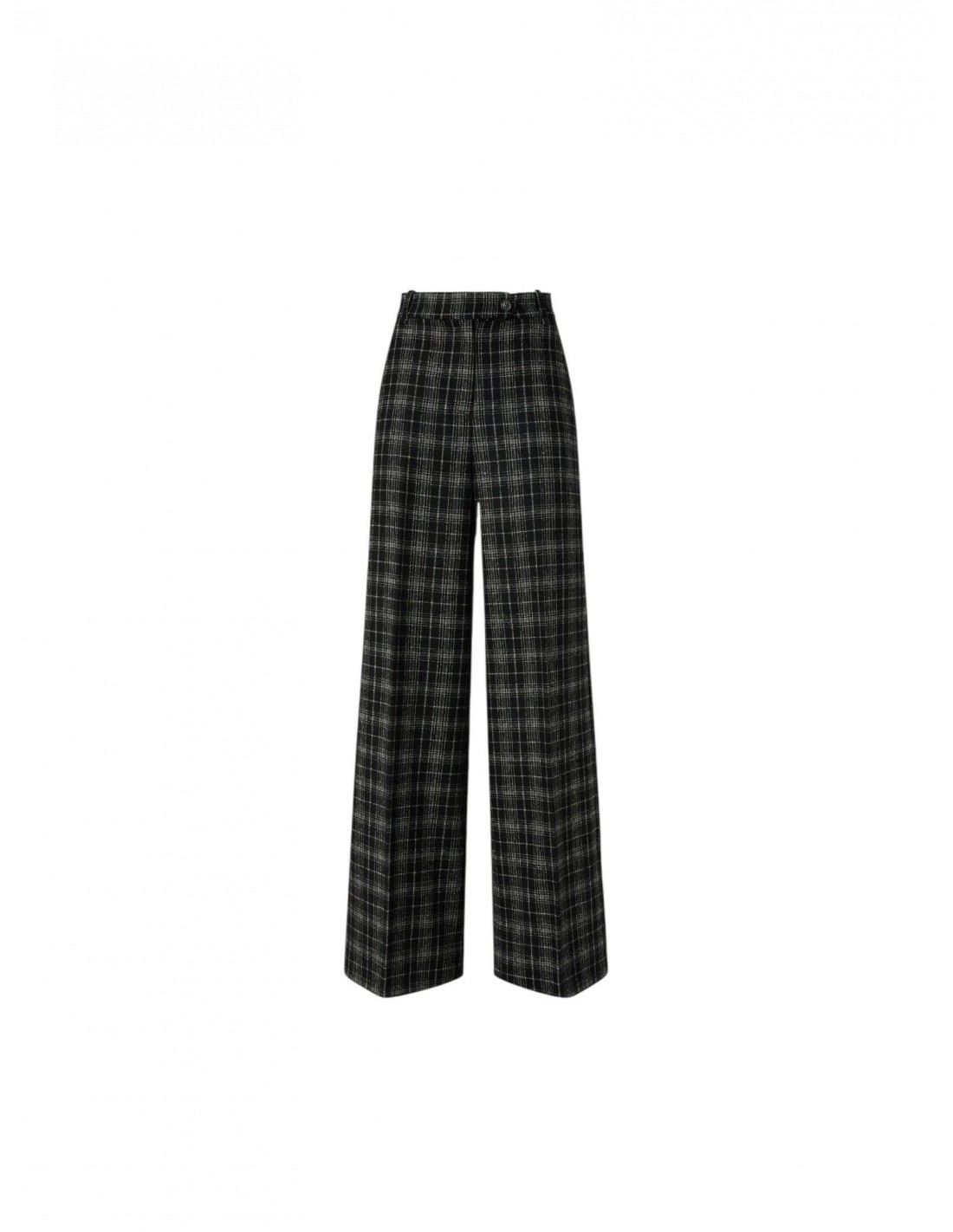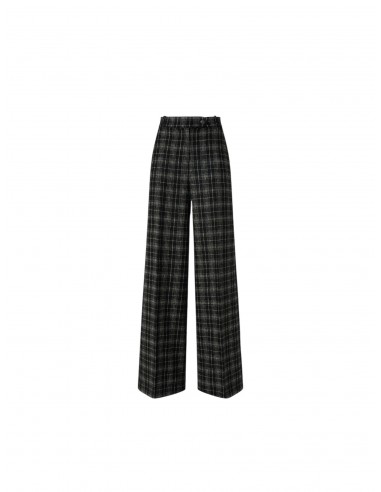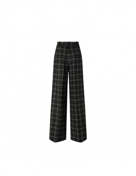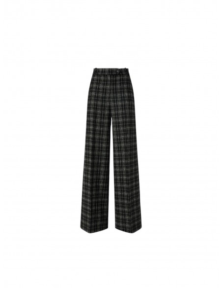 Pantaloni lunghi d'ispirazione sartoriale realizzati in misto lana tinto in filo con motivo a quadri all over. Il capo, caratterizzato da una silhouette ampia a palazzo e dalla piega stirata centrale lungo la gamba, è completato dalla chiusura frontale con zip e bottone decentrato. Indossa questo modello con la giacca coordinata per creare un total look ideale per le occasioni formali, oppure abbinalo a capi più casual per un outfit quotidiano che non rinuncia allo stile.