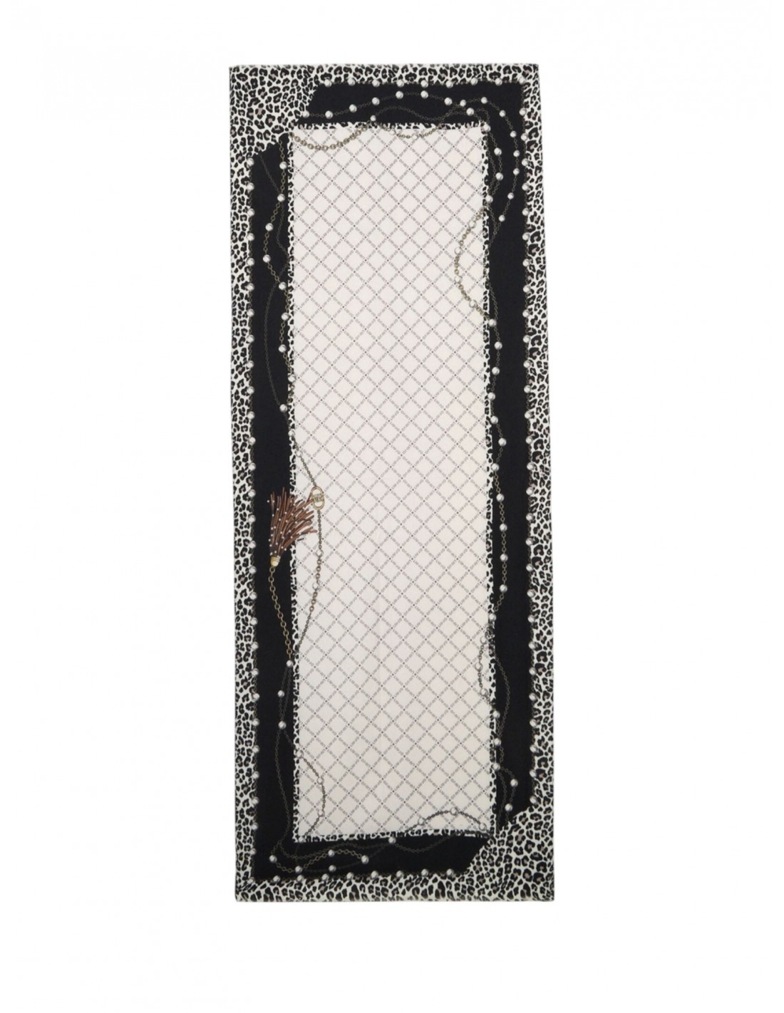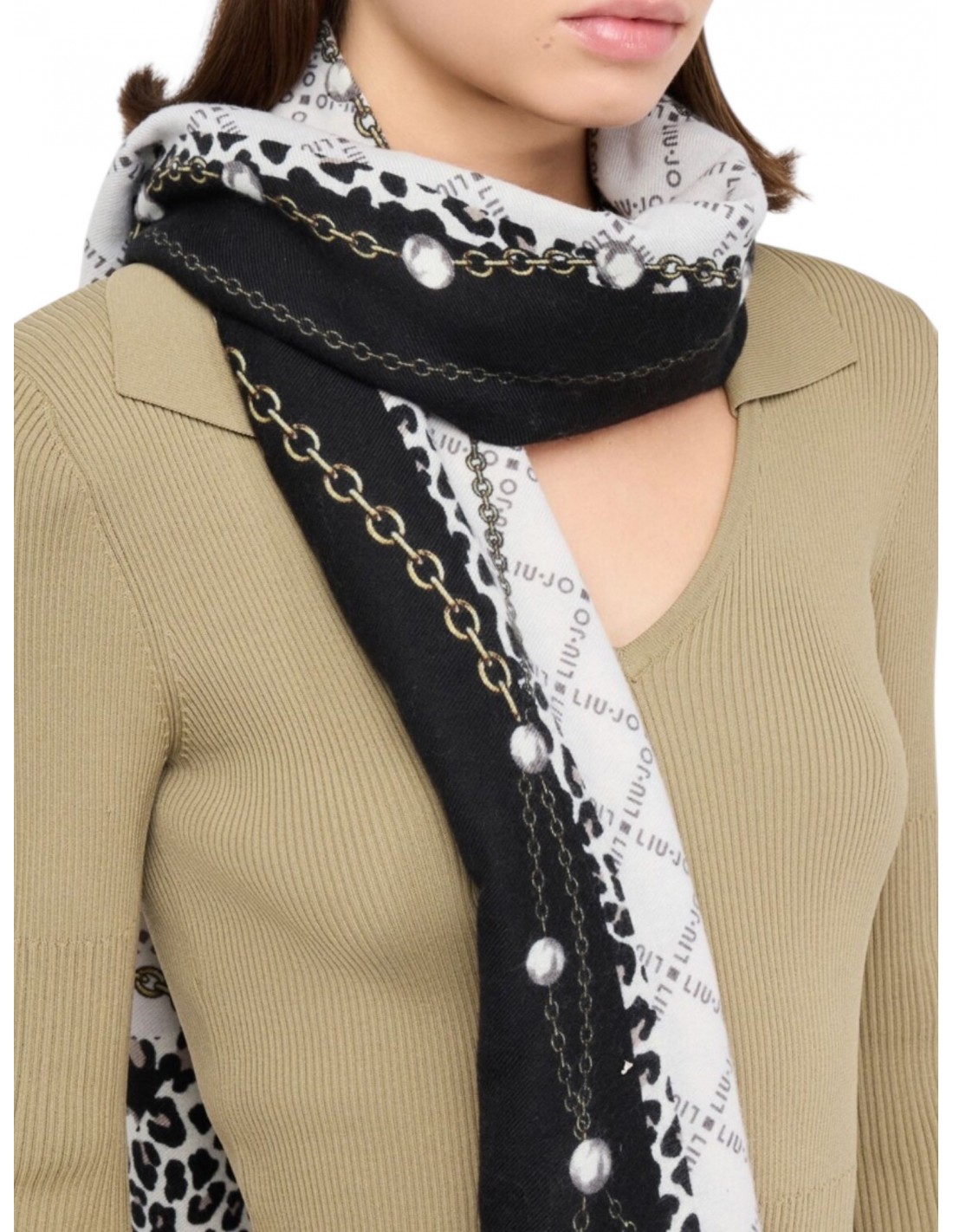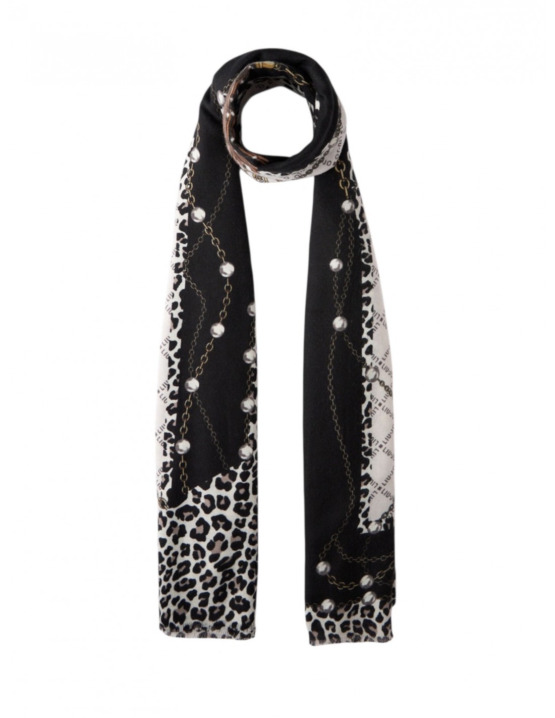 Misure: 70 x 180 cm Stola nera Stampa animalier con logo Bordi sfrangiati Presenta pochette logata Prodotto "Liu Jo Better"