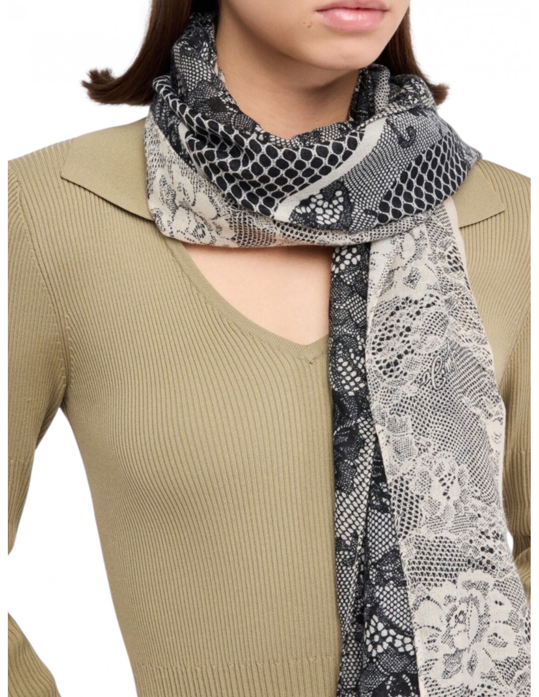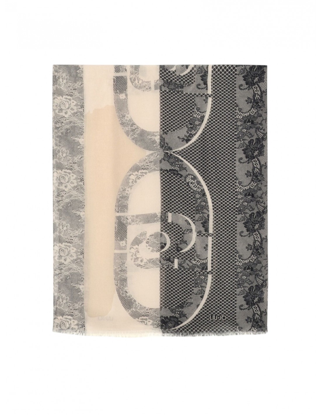 Misure: 70 x 180 cm Stola stampata Motivo pizzo con logo Presenta pochette logata Prodotto "Liu Jo Better"