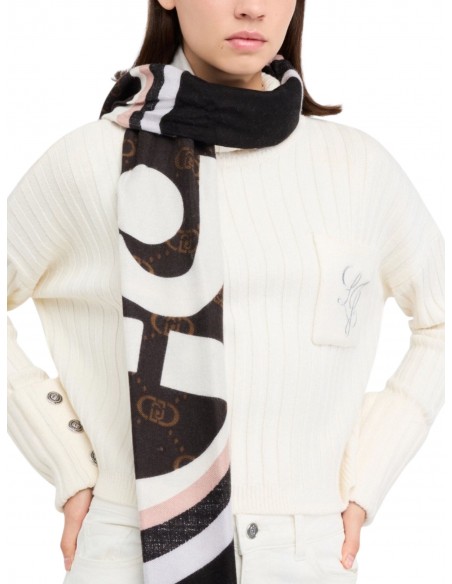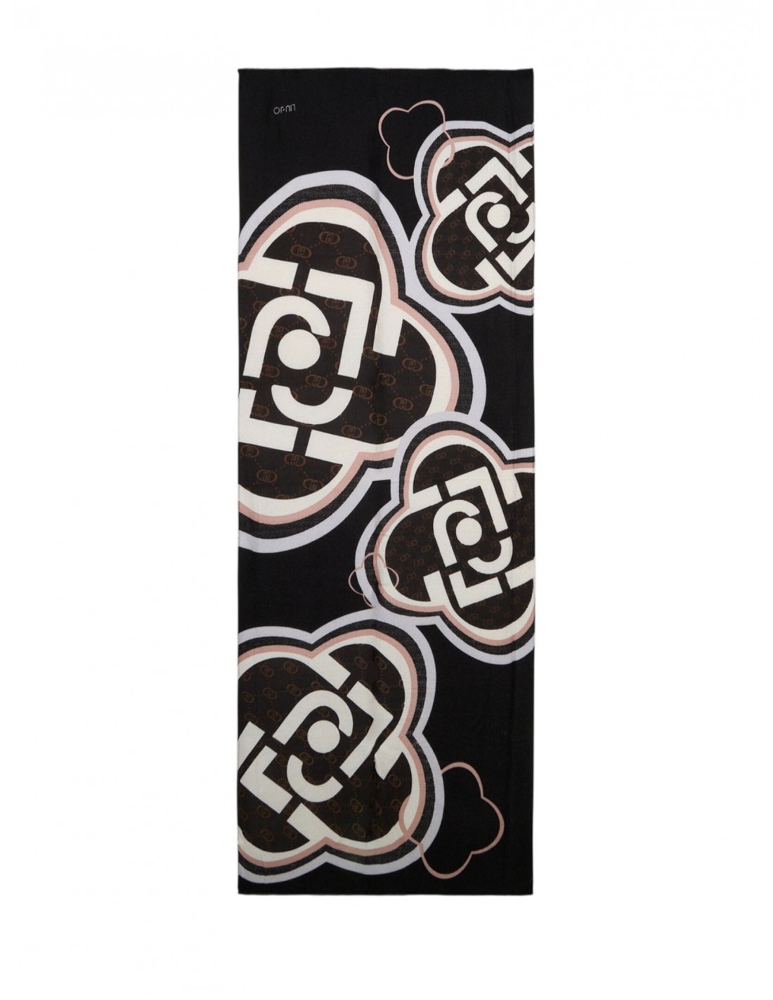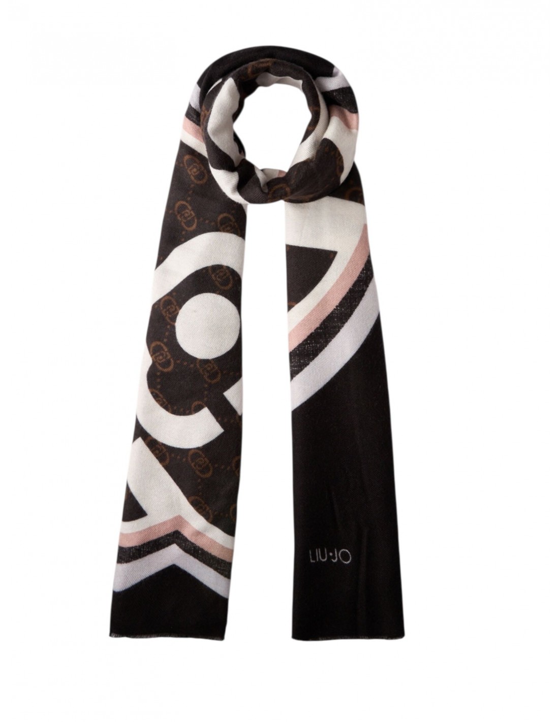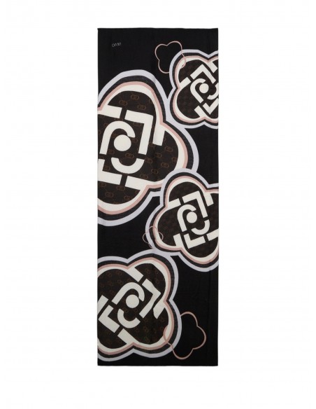 Misure: 70 x 180 cm Stola nera Realizzata in viscosa Stampa logo Bordi sfrangiati Presenta pochette logata