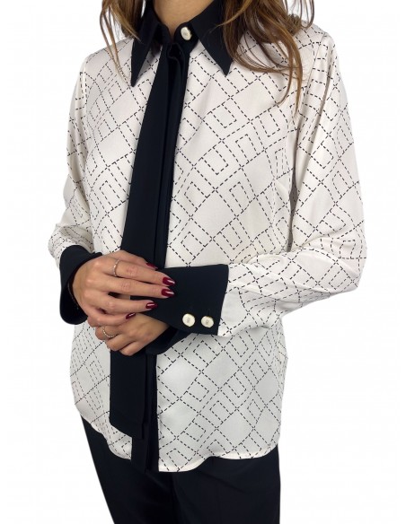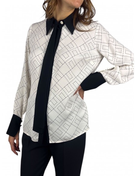 Camicia in georgette dalla vestibilità slim. Presenta colletto con doppio foulard, polsi alti e asimmetrici con bottoni smaltati e si distingue per la stampa con pattern di collezione che crea un dinamico motivo bi-color, esaltato dai bordi a contrasto.