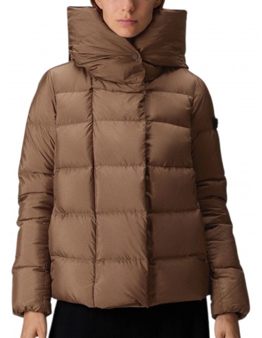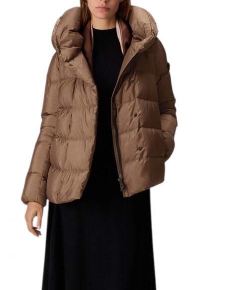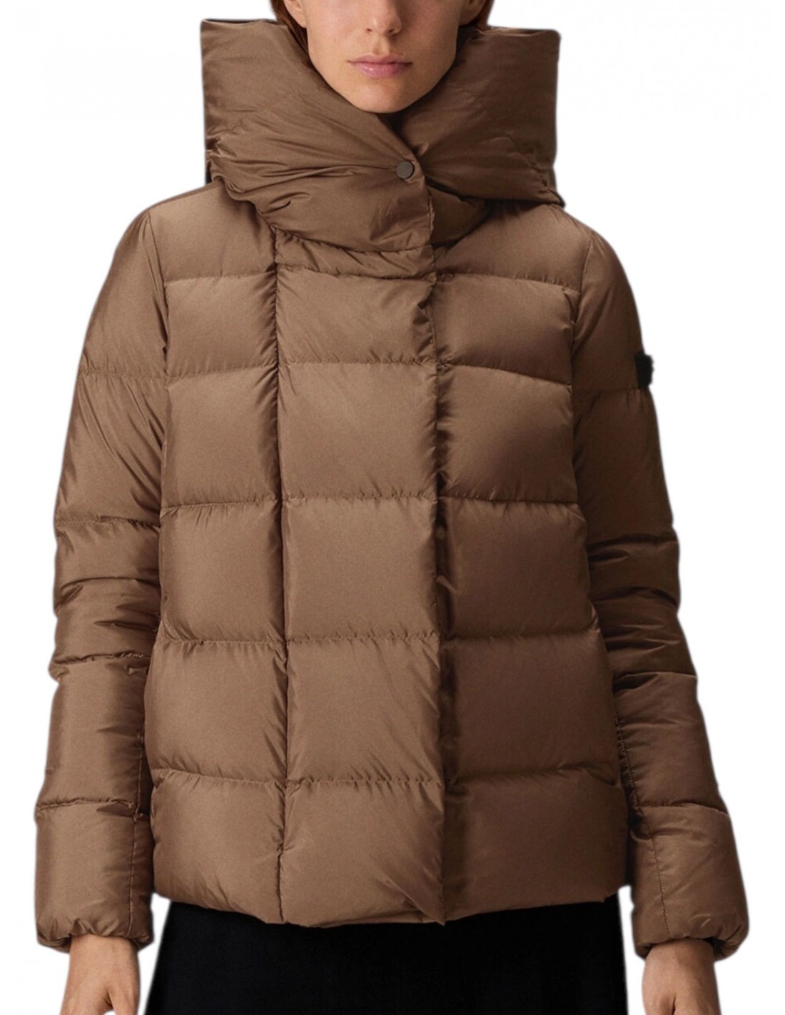 Piumino corto in tessuto superleggero, realizzato in 100% poliestere riciclato post consumo dalla mano morbida, struttura ultra compatta e finitura semi-opaca. L’imbottitura in piuma naturale certificata garantisce calore e leggerezza, mentre il trattamento idrorepellente PFC Free protegge dalle condizioni atmosferiche più variabili, nel rispetto dell’ambiente. La varietà dei dettagli fa di questo capo un must-have del guardaroba femminile di questa stagione: full zip centrale e bottoni a pressione nascosti da patta, tasche laterali a scomparsa con bottone singolo a pressione, ampio collo a scialle che avvolge dolcemente proteggendo dalle intemperie e cappuccio fisso. Un capo riconoscibile per il perfetto mix tra estetica, praticità e stile urban, adatto a chi vive con dinamicità,